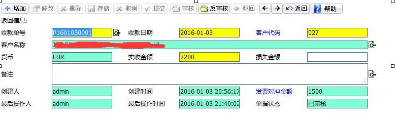 新增时,录入客户代码,带出客户名称及客户当前所用货币。实收金额:实际收款的金额损失金额:因品质或其它原因客户扣除的金额发票对冲金额:由销售发票与收款对冲单审核时刷新。